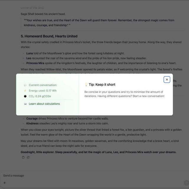 Wat GreenPT onderscheidt, is dat gebruikers exact kunnen zien hoeveel energie hun AI-interacties verbruiken en welke uitstoot daarmee gepaard gaat. Bij iedere vraag wordt direct de bijbehorende CO₂-emissie weergegeven, inclusief cumulatieve statistieken. Dit stelt organisaties in staat weloverwogen beslissingen te nemen en hun AI-gebruik te verduurzamen.