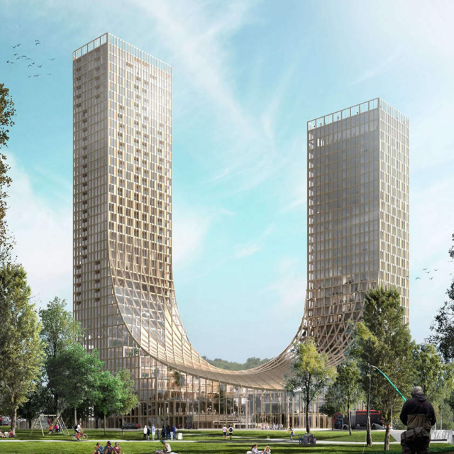 The Dutch Mountains in Eindhoven wordt met een omvang van ruim 65.000 m2 en een hoogte van 133 meter het grootste houten-hybride gebouw van de wereld. Vandaag werd de verkoopovereenkomst voor dit iconische project symbolisch ondertekend door wethouder Stijn Steenbakkers en de initiatiefnemers Urban Xchange, Studio Marco Vermeulen, BLOC en Lingotto. In het gebouw worden onder meer woningen, kantoren, een hotel en een conferentiecentrum gerealiseerd.
