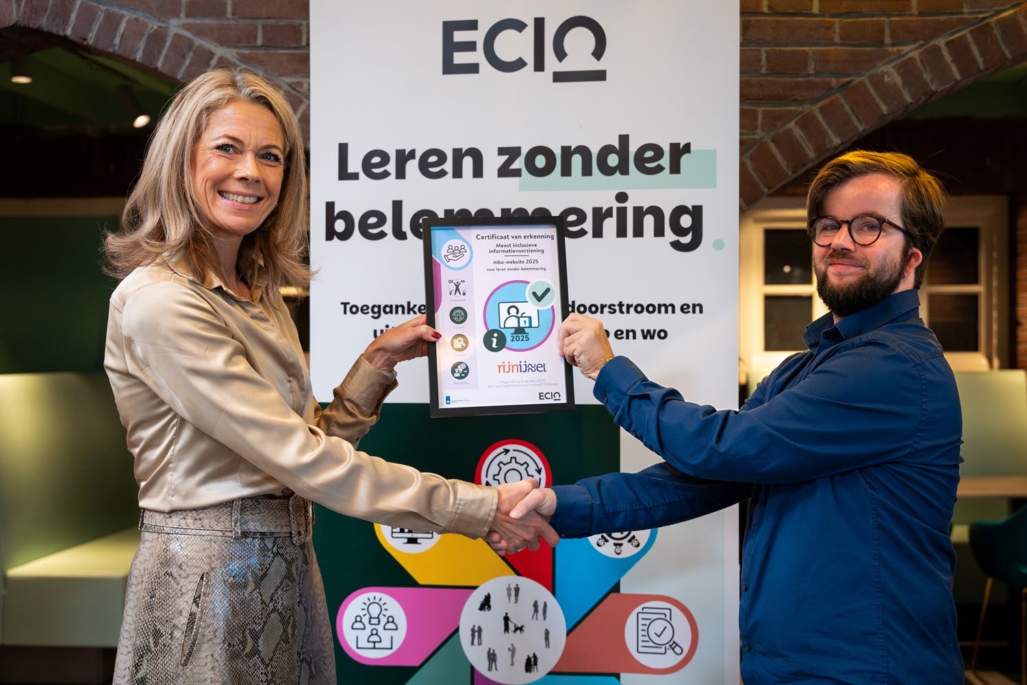Rijn IJssel ontving vandaag het keurmerk en bijbehorend certificaat ‘Meest inclusieve mbo-website 2025’. Het certificaat werd door Frank Schoonbeek van ECIO uitgereikt aan Karina Visscher, bestuurder van het Rijn IJssel. Het keurmerk wordt zichtbaar op de website van Rijn IJssel. Deze erkenning benadrukt het belang van inclusieve online informatievoorziening voor mbo-studenten.